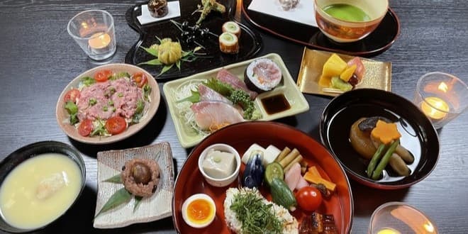 Hassun(assorted dish), Nitakimono(simmered dish), Otsukuri(sliced raw fish), White miso soup, meat dish, seasonal vegetables, Jako Shiso rice, Mizumono, Matcha, Okashi